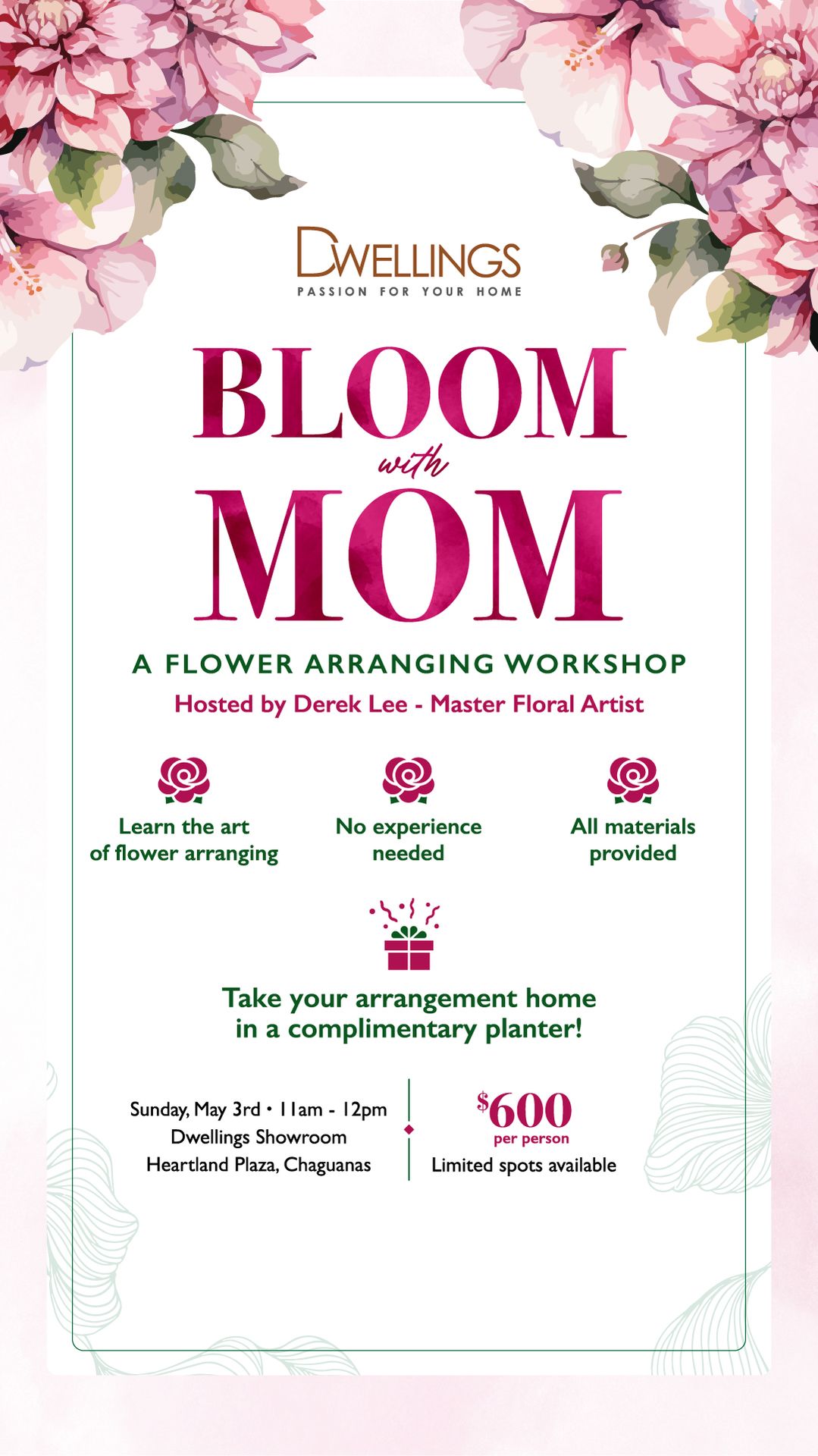 Celebrate Mother’s Day in a beautiful and creative way at Bloom with Mom, a special flower arranging workshop hosted at the Dwellings Showroom, Heartland Plaza, Chaguanas.
